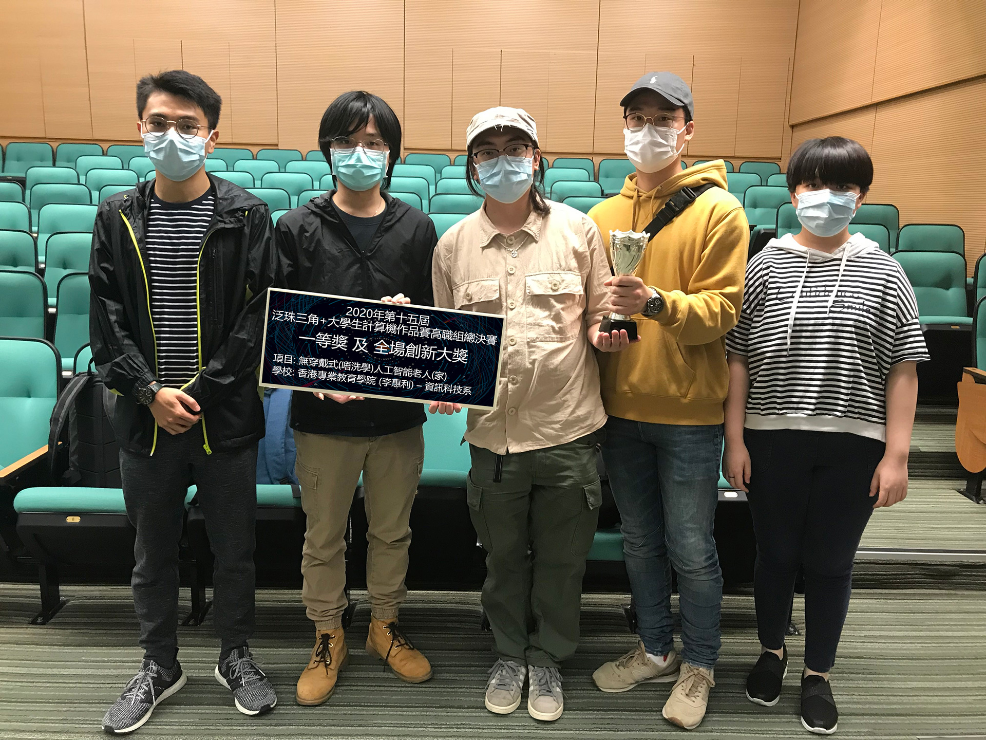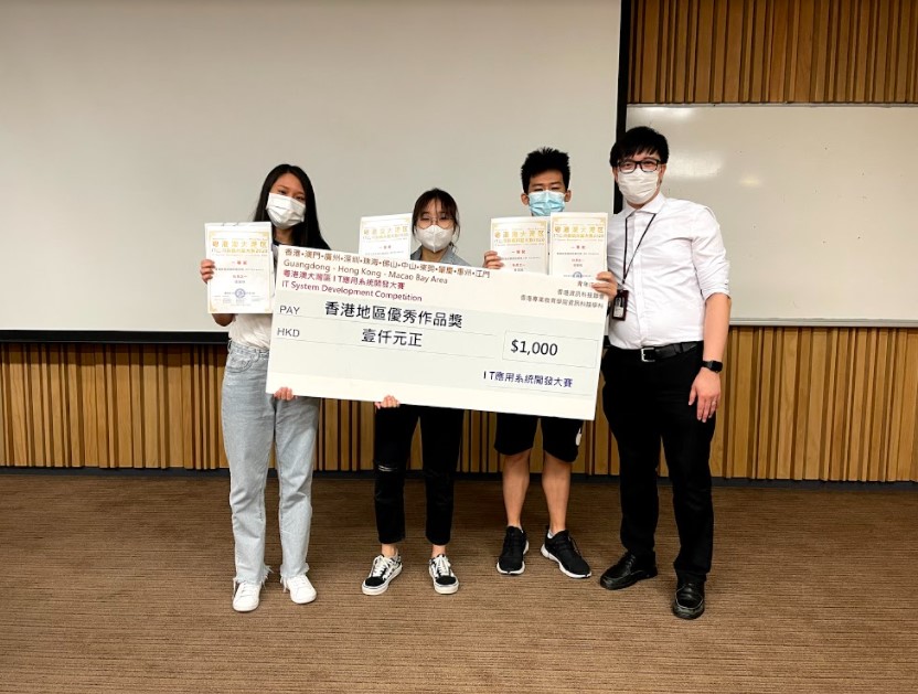 就讀雲端系統及數據中心管理高級文憑的兩名學生何沛君和黃照正,憑作品「無穿戴式(唔洗學)人工智能老人家」,獲得賽事高職組一等獎及全場創新獎。同科的羅鎂晴,則以作品「All Screens雲端智能虛擬助教系統」得三等獎。
