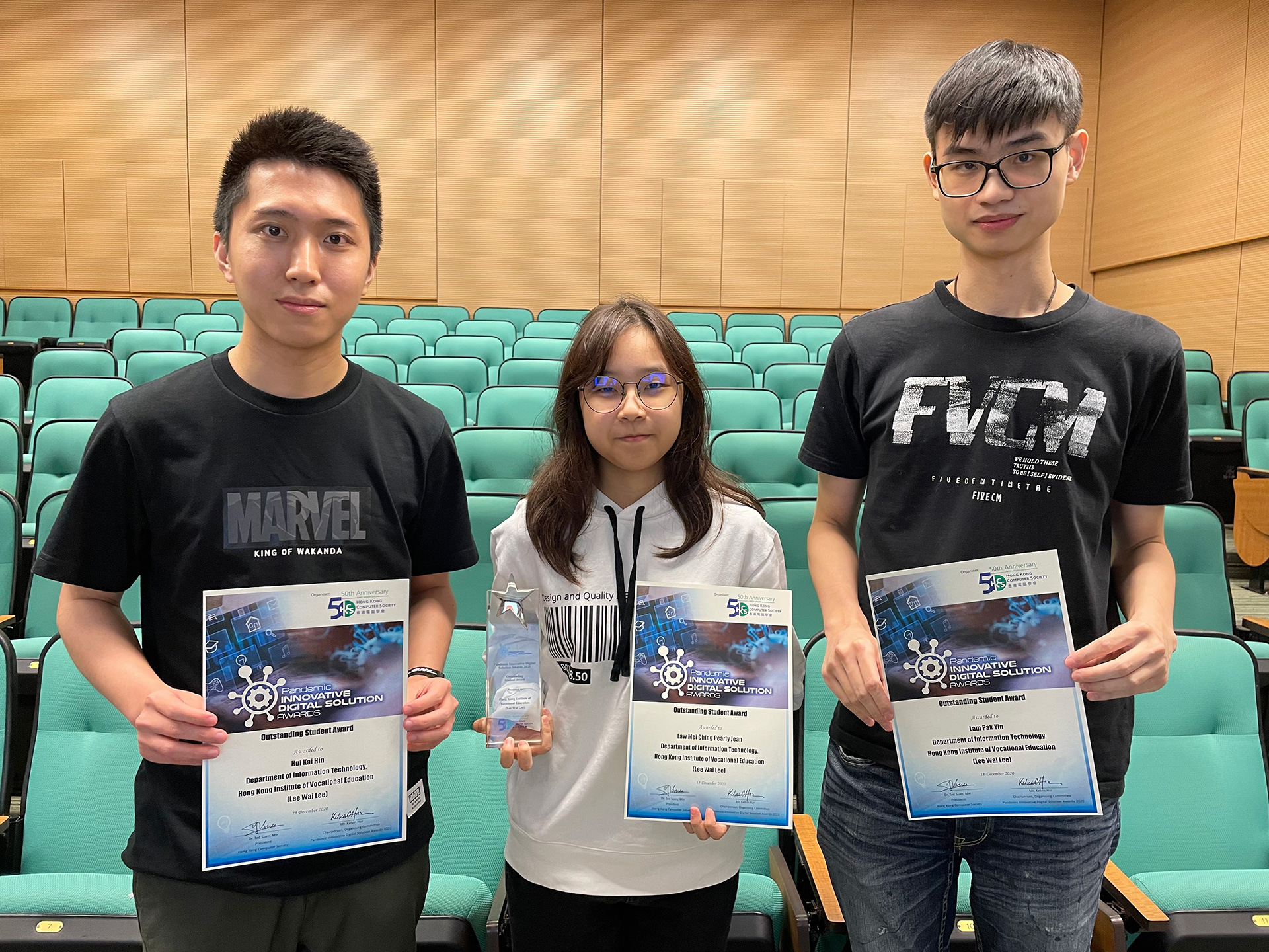 四名雲端系統及數據中心管理高級文憑學生,霍偉賢、羅鎂晴、伍善正及蘇偉欣,憑作品「擴增實境AI駭客助教」奪得學生創新(大專及本科組)獎金獎。他們設計的虛擬助教,能協助老師監察同學上課情況,從而知道學生有否缺席或在考試中作弊。另外,企業共創中心和就讀本學科學士學位銜接課程的學生吳穎橋,則以自行研發的「演講指導系統」和「Hong Kong Culture Visit – AR」,分別於數碼娛樂(互動設計)獎中,奪得銅獎和優異證書。