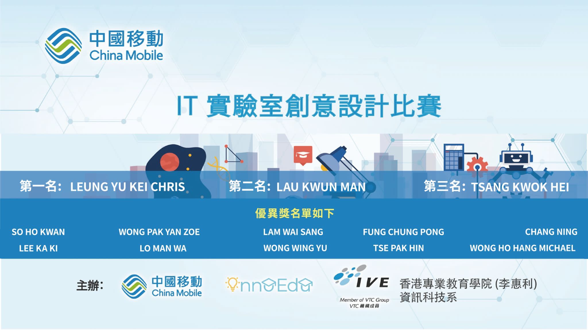 中國移動香港與資訊科技教育領袖協會合辦,聯合 InnoEdu 及香港專業教育學院(李惠利分校) 共同打造「IT 實驗室創意設計孵化計畫」。是次計畫順利完成,承蒙香港專業教育學院(李惠利分校)及香港專業教育學院(屯門分校)資訊科技系「數碼媒體(榮譽)理學士學位」課程的同學及老師鼎力支持,成功為 20 間學校免費提供度身訂造 IT Lab/ STEM 室內設計方案,為師生帶來新的教學體驗,鼓勵學生在 IT Lab/ STEM 方面發揮潛能。
